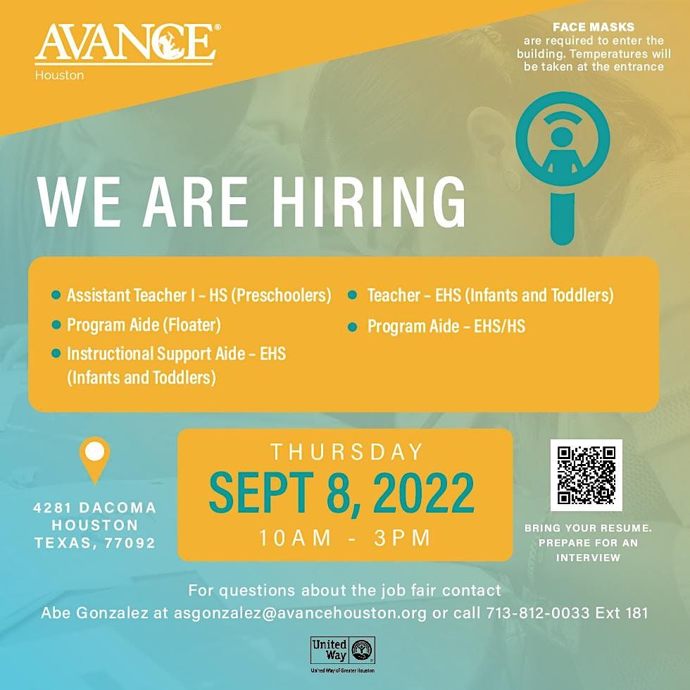 AVANCE HOUSTON WE ARE HIRING JOB FAIR, 4281 St, Houston, 8, Houston will add close to 60,000 jobs in 2024,. At the humble civic center โ8233 will clayton parkway, humble.